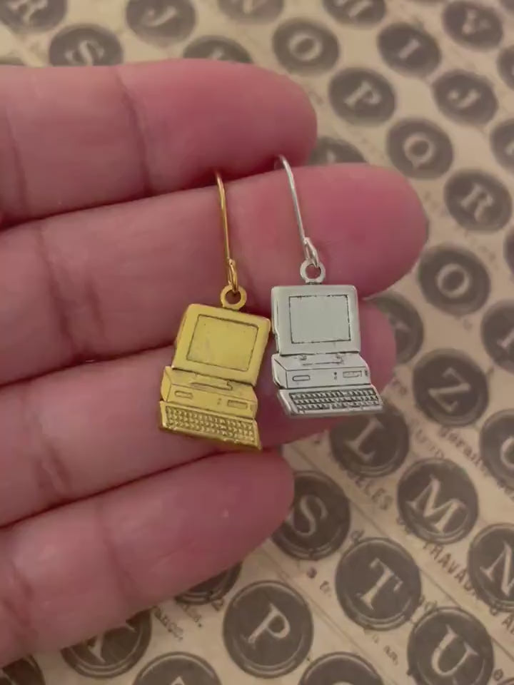 These earrings are a nostalgic and charming accessory that can bring back memories of the days when technology was less advanced. They remind us of bulky monitors and large floppy discs that takes us back to an era when computers and storage devices were quite different from what we have today. The earrings, with their raw brass plated charms measuring about .5" long, provide a tangible reminder of how far technology has progressed.