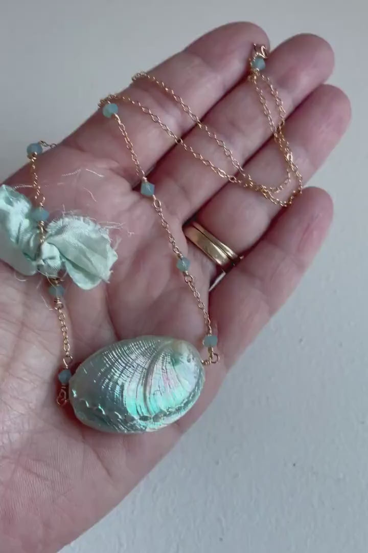 The combination of the glinting iridescent shell, the Pacific opal Swarovski crystals, and the delicate 14k gold-filled chain creates a stunning piece of jewelry. The addition of the upcycled sari ribbon gives it a unique vintage touch, adding to its charm. With the centerpiece being the beautiful iridescent shell, it's likely to draw attention and captivate admirers with its natural beauty. The Pacific opal Swarovski crystals, known for their shimmering colors, enhance the overall sparkle and elegance of the necklace.