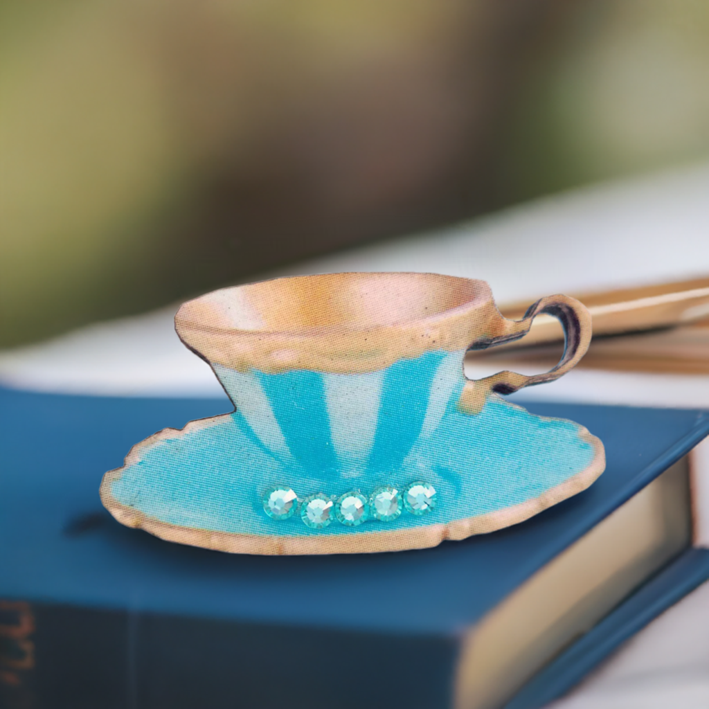 This wood teacup brooch is a unique and eye-catching accessory. This is a TGAT exclusive. To add a touch of sparkle, genuine Swarovski Crystals are incorporated into the design. The brooch's vintage-style aesthetic is sure to stand out and add a pop of color to your jewelry collection.