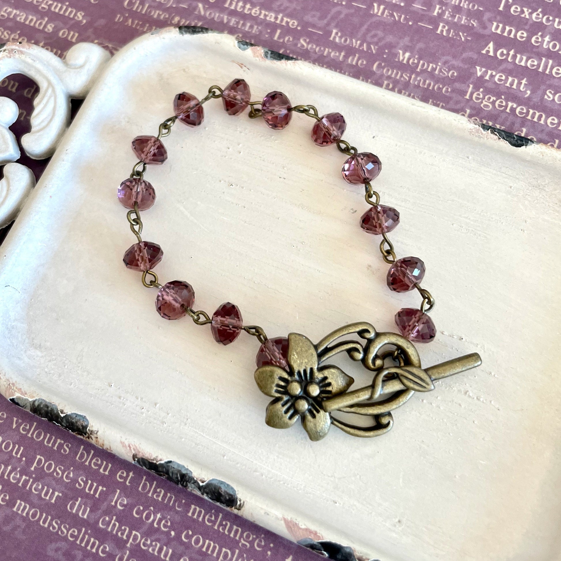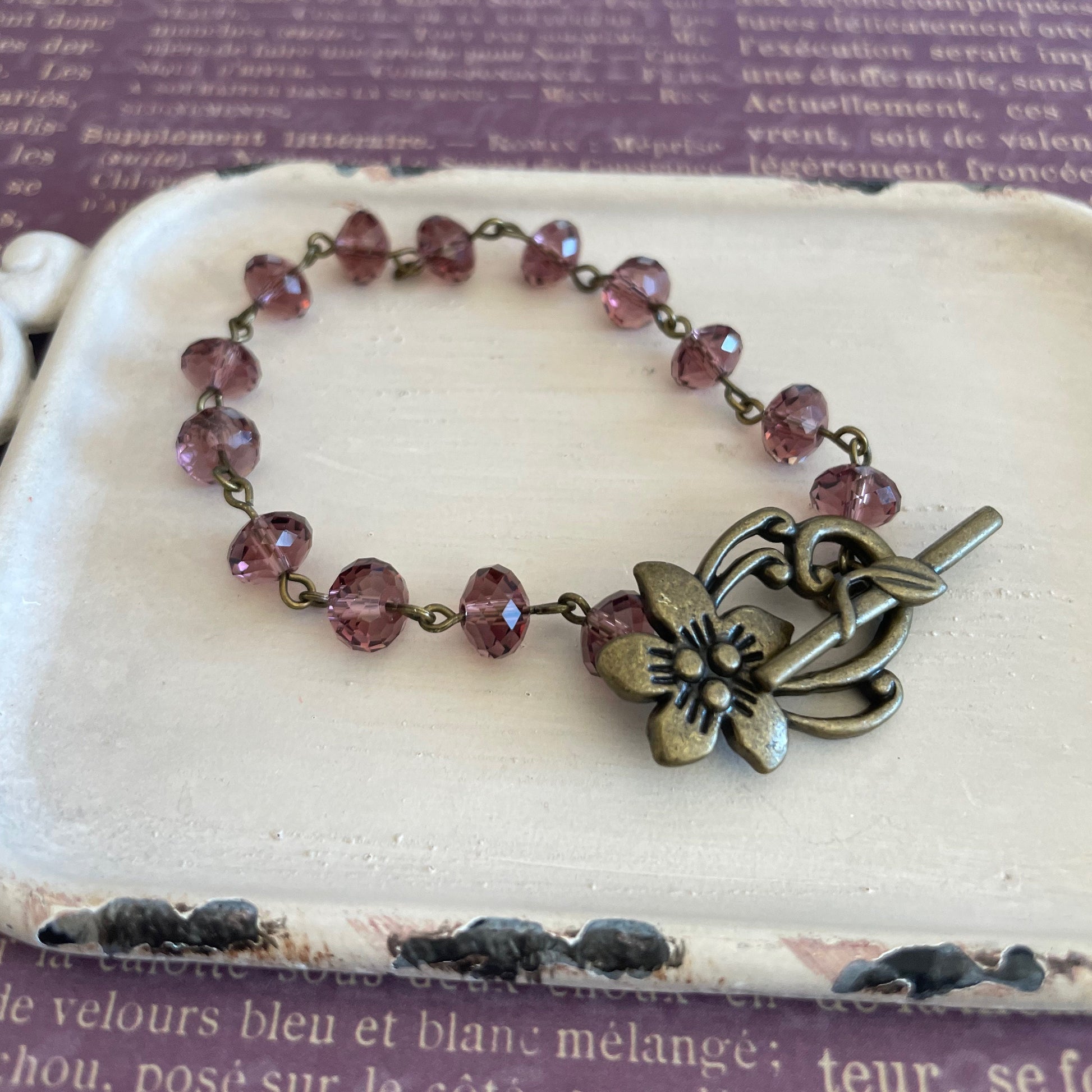 Using an antique brass flower toggle clasp adds a charming and vintage touch to the bracelet. It's great that you chose a clasp that complements the overall aesthetic of the piece.