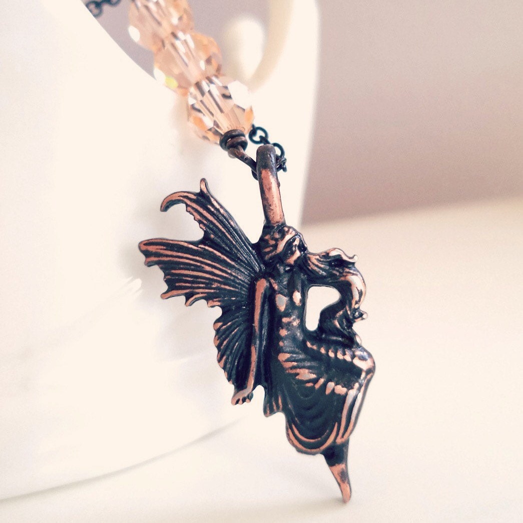 The charm hangs on a black tone chain wrapped with three sparkling Swarovski crystal beads in the light peach shade makes for a lovely combination. The crystals add a touch of sparkle and a pop of color to the overall design. The use of a black tone chain complements the antique patina of the charm and adds a sleek and contemporary contrast.