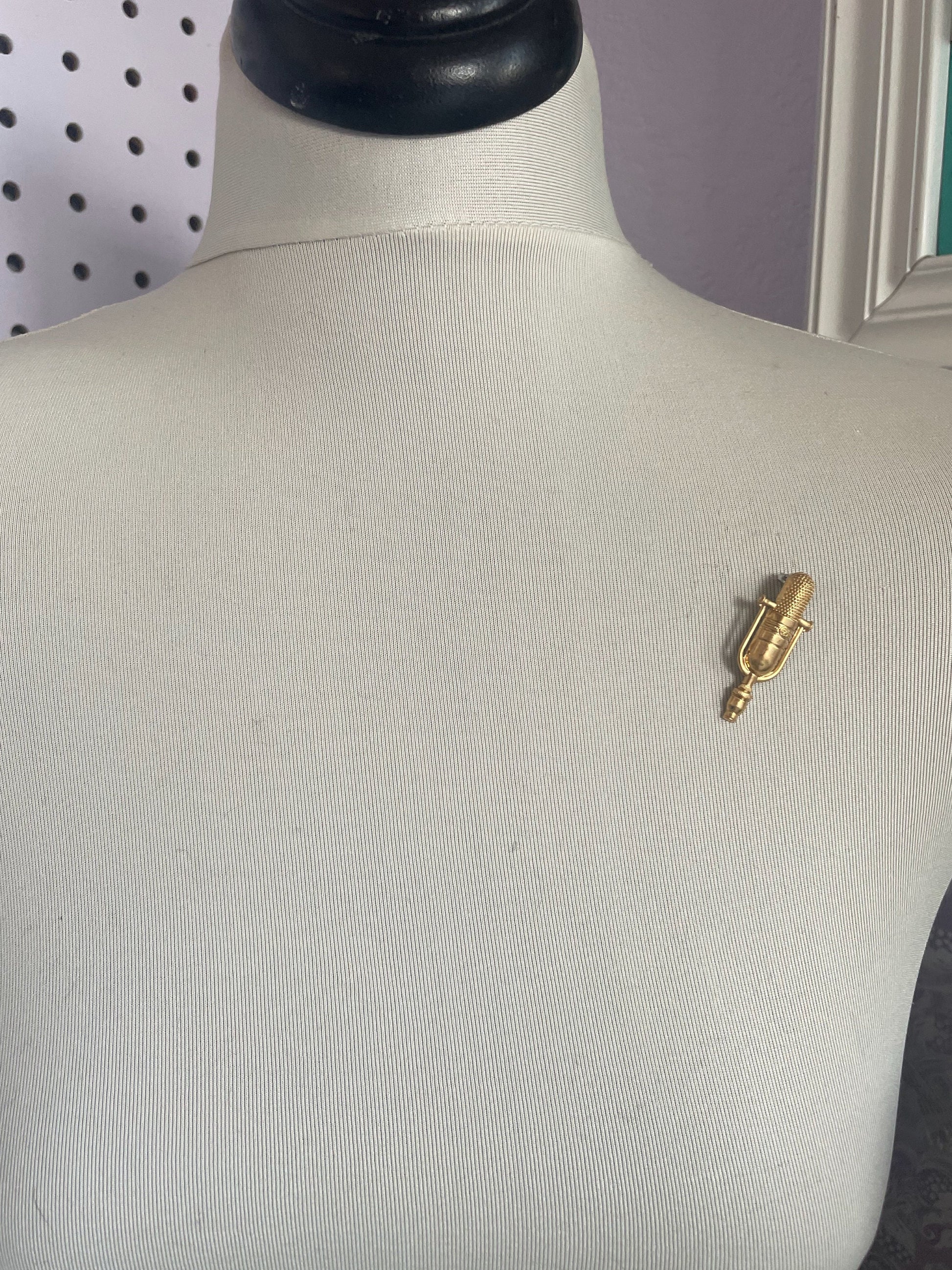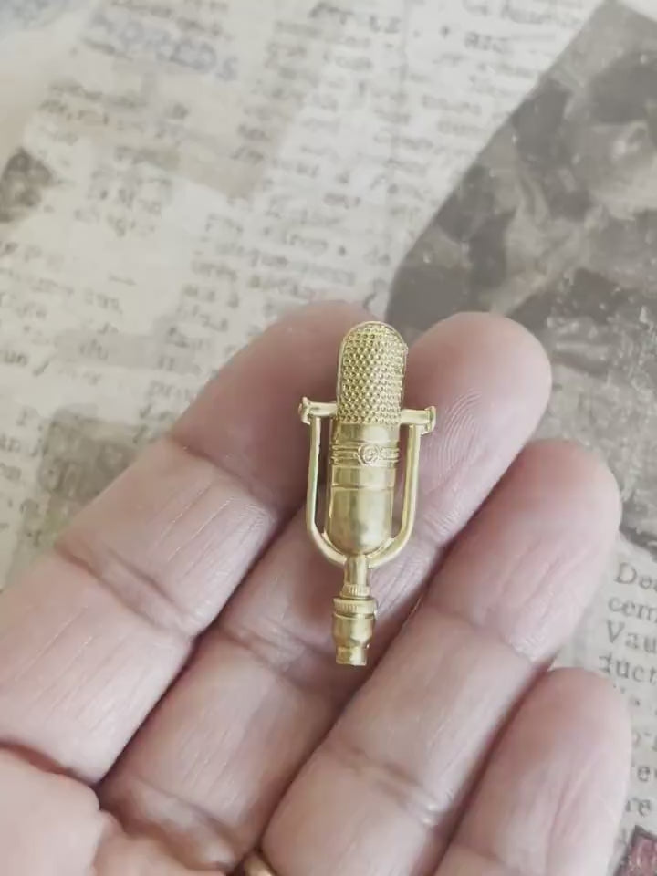 This microphone brass pin is a fantastic accessory to enhance any outfit with just the right amount of flair. Measuring nearly 1.5" tall and featuring a straight pin back, it offers a convenient and secure way to attach it to various clothing items.