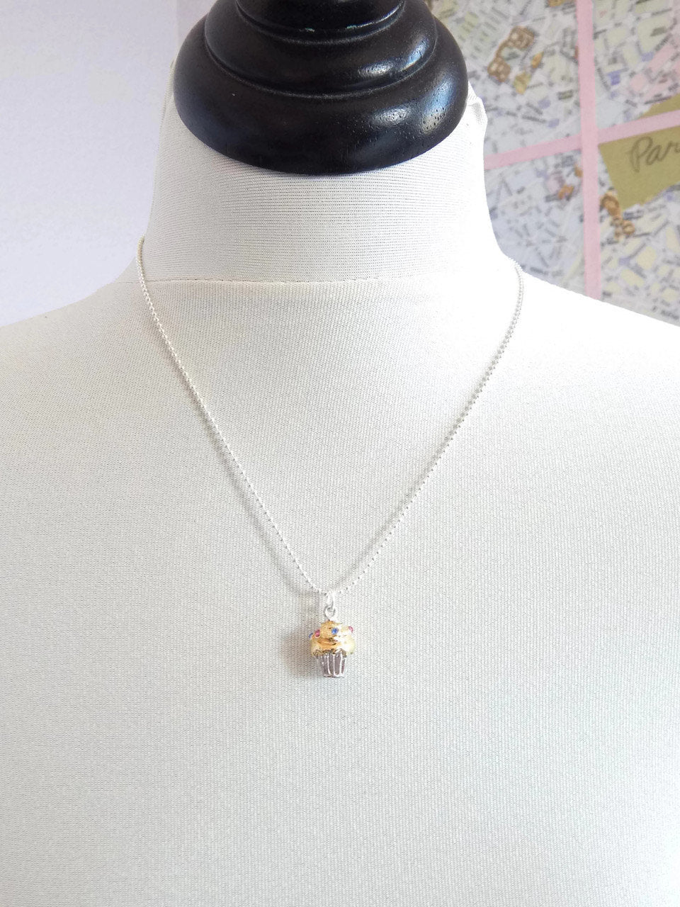 The enameled pink "frosting" and the sprinkling of blue, pink, and yellow crystals add a touch of whimsy and sparkle to the design. The 16" silver-plated ball chain provides a sleek and elegant base for the charming cupcake pendant. It sounds like a lovely piece of jewelry that captures the joy and sweetness of cupcakes. Enjoy wearing it and showcasing your love for this delicious trend!