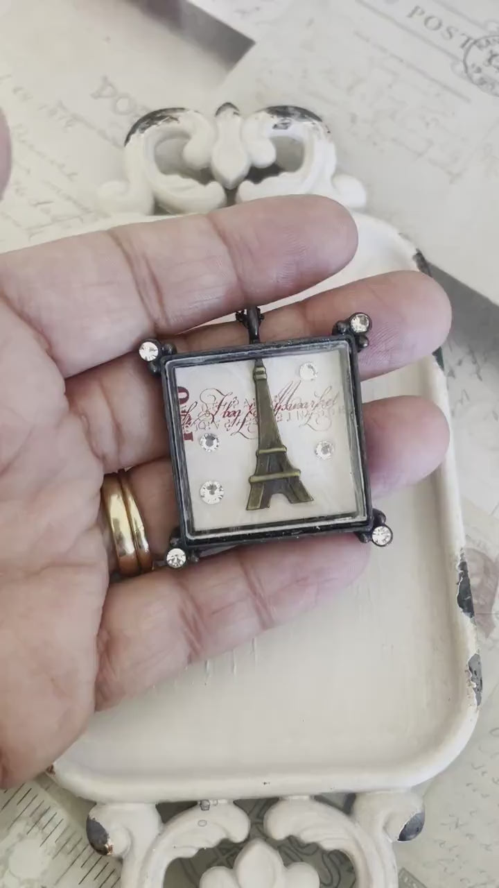 This necklace has a beautiful blend of vintage and modern styles. The mini shadow box pendant measures 1.5x1.5" and serves as a unique and captivating focal point for the necklace. The antique brass Eiffel Tower charm inside the box adds a touch of nostalgia and romanticism.