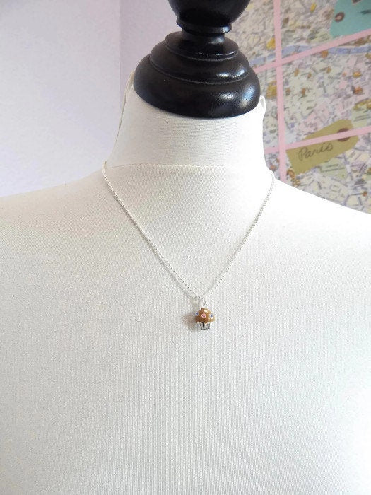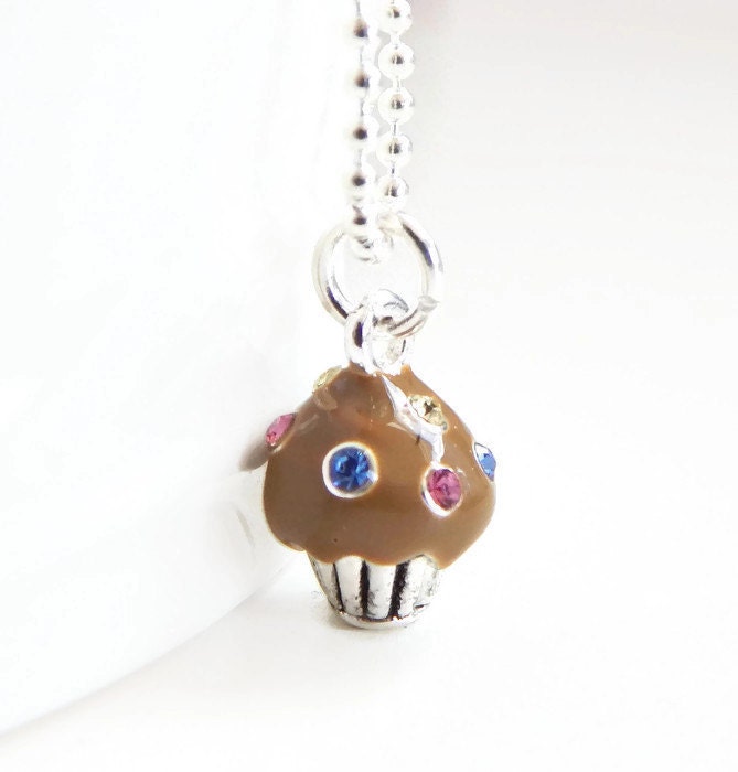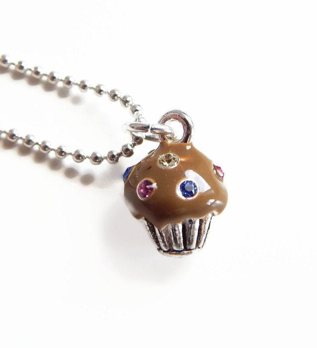 The necklace is delightful with its enameled chocolate brown "frosting" and the sprinkling of blue, pink, and yellow crystals. The combination of colors and textures creates a visually appealing and whimsical design. The 16" silver-plated ball chain provides a sleek and versatile backdrop for the charming cupcake pendant. It's a lovely way to showcase your love for cupcakes and add a touch of sweetness to your style.