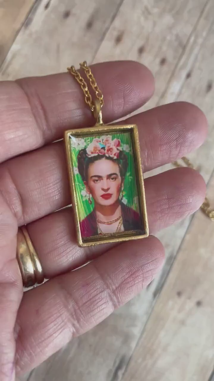 This necklace is a beautiful and unique necklace paying homage to Frida Kahlo, the renowned Mexican artist. The vibrant portrait enclosed in resin creates an eye-catching and artistic piece. The gold plated chain measures 17". The pendant is about 1.5" long. The photo has unique streaks along the size that change to color of the photo making it a one of a kind piece.