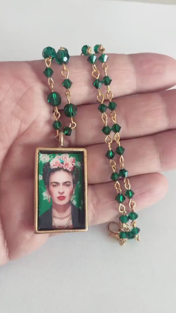 This necklace is a stunning and distinctive accessory honoring Frida Kahlo, a notable Mexican artist. The blend of dazzling emerald Swarovski crystals, gold plated wire, and the vivid portrait encased in resin results in a captivating and artistic creation.
