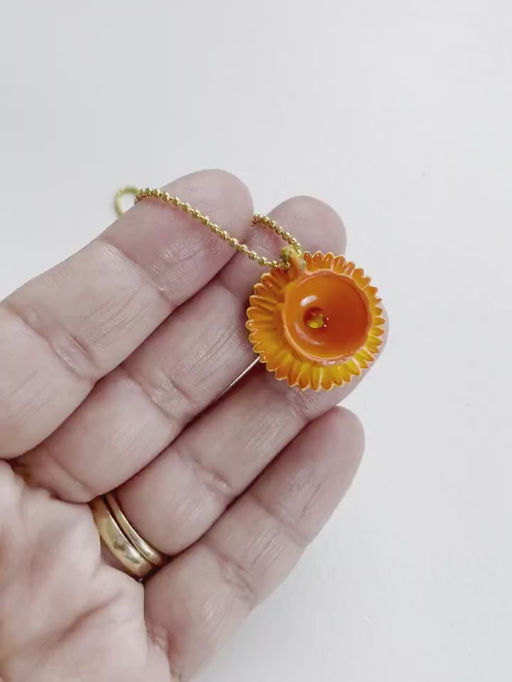 The teacup necklace can resemble both a little orange pumpkin and a bright marigold depending on the angle adds a whimsical and playful touch to the accessory. Marigolds are often associated with the beauty and warmth of the sun, symbolizing positivity, joy, and optimism. The representation of a marigold on the necklace can serve as a reminder of these qualities and evoke a sense of brightness and cheerfulness.