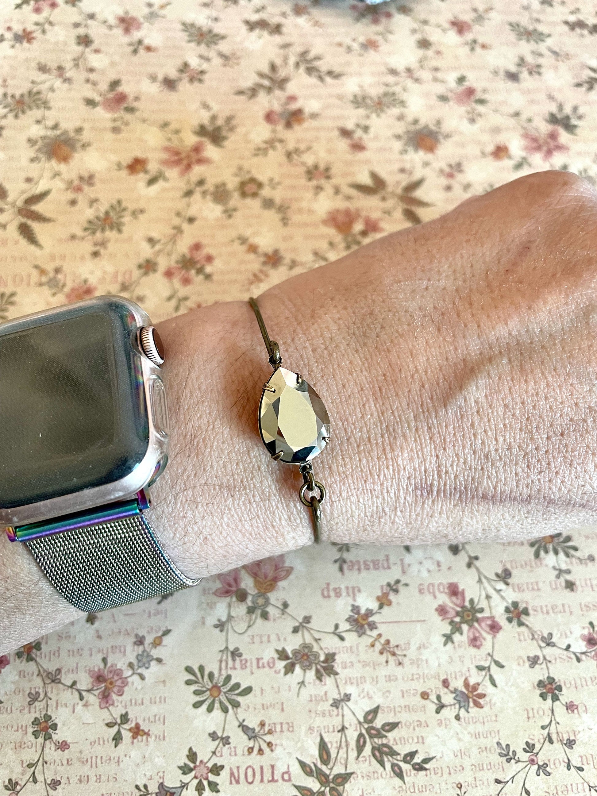 This delicate bracelet connects a large mirror like tear shaped Austrian crystal with antique brass wire. Stackable bracelets are on-trend and ready to make your arm candy pop. Each stone is a handset and measures 18x13mm. The jewels are genuine Swarovski crystals. The bracelet fits about 6".