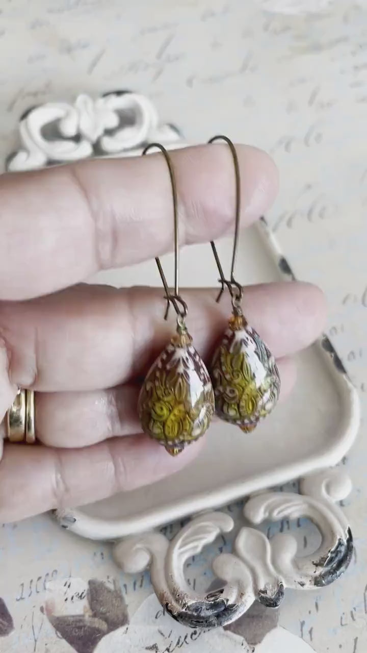 These earrings are absolutely stunning. The combination of the purple paisley-designed beads, antique brass ear wires, and Swarovski crystal copper bicones creates a unique and elegant design. The use of thermo-sensitive liquid crystal in the beads adds an intriguing element, as the colors change with the temperature of your skin.