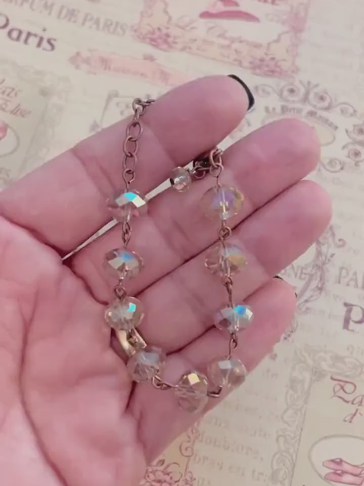 This beaded bracelet is made with 10mm rondelles in a soft champagne hue. Each bead also has a slight iridescence and pairs perfectly with the antique copper metal. The necklace is adjustable and can be worn as short as 6.5" and as long as 8". Picture 4 is for styling purposes only.