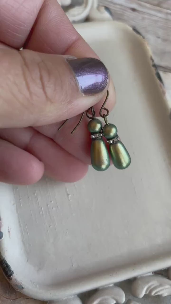 The choice of antique brass ear wires not only adds to the retro vibe but also complements the iridescent green and golden sheen of the pearls, creating a cohesive and stylish look.