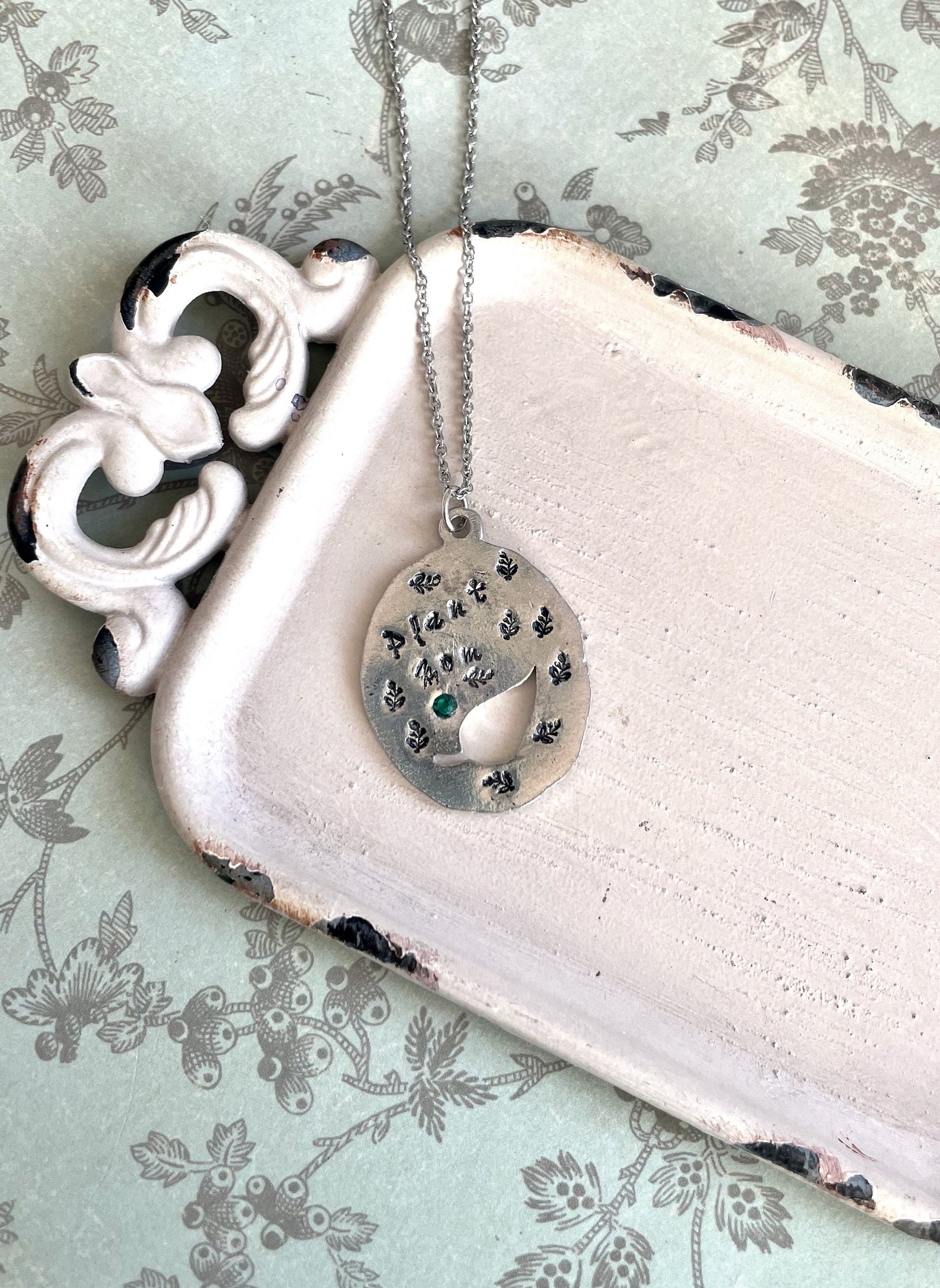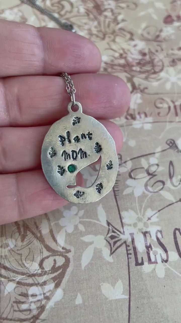 I have hand-stamped the pendant with the inscription "Plant mom" and added a touch of sparkle with the emerald green Swarovski crystal. The inclusion of a small leaf cut out of the pendant adds a nice botanical element to the design. Since the necklace is handmade, that there may be slight differences between each pendant, making each piece unique.