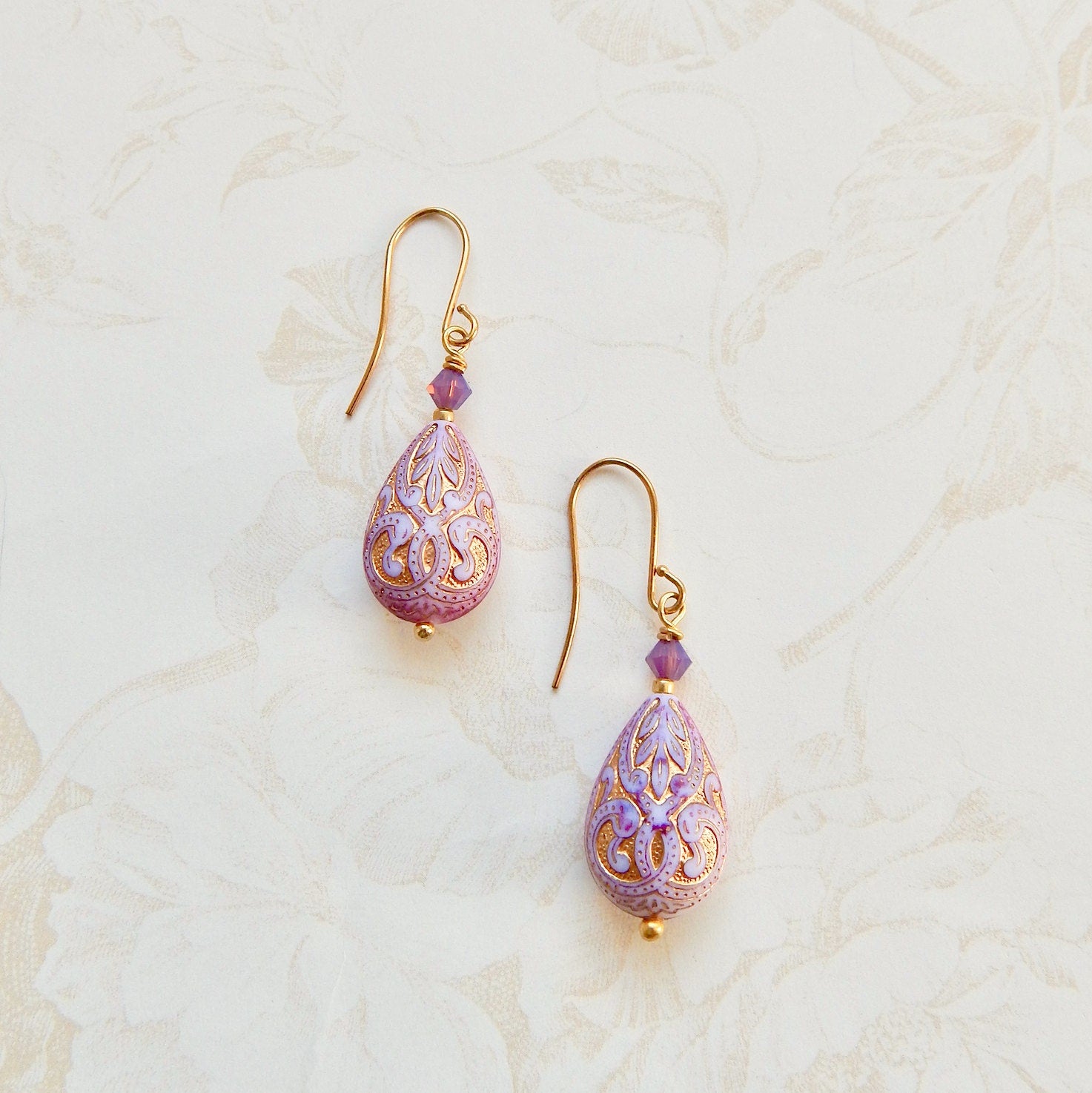 These handmade vintage-inspired lavender earrings are absolutely charming! The use of acrylic teardrop beads etched with a paisley design adds a touch of elegance and adds visual interest to the earrings. The .75" size of the beads is a nice focal point without being too overwhelming.