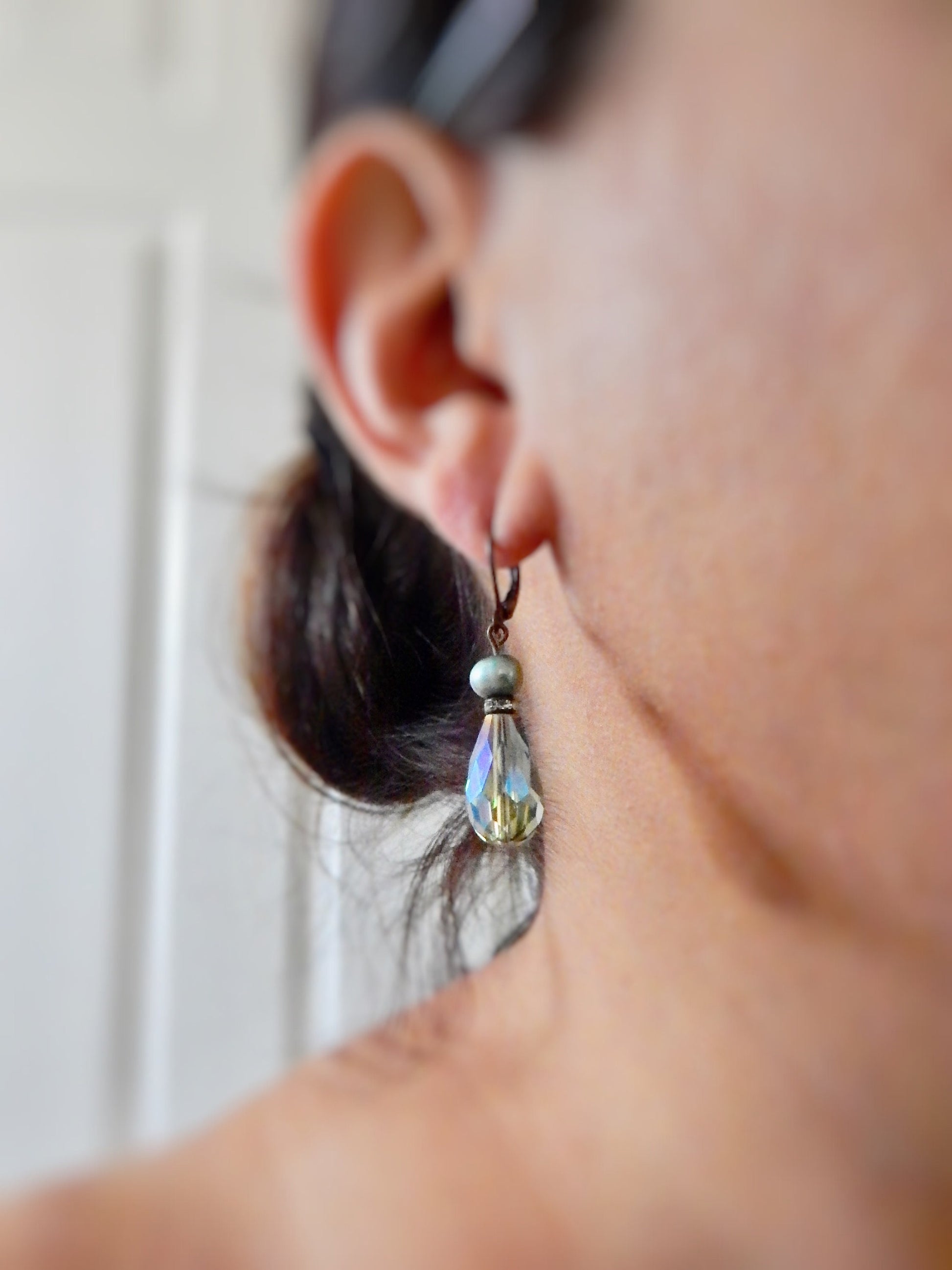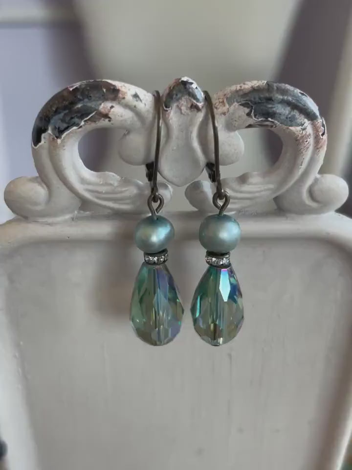 These elegant earrings capture the essence of the sea beautifully. The iridescent blue teardrop beads with shades of blues and greens give a mesmerizing and aquatic feel. The hand-wrapped crystal rondelles add a touch of sparkle and enhance the overall elegance of the design.