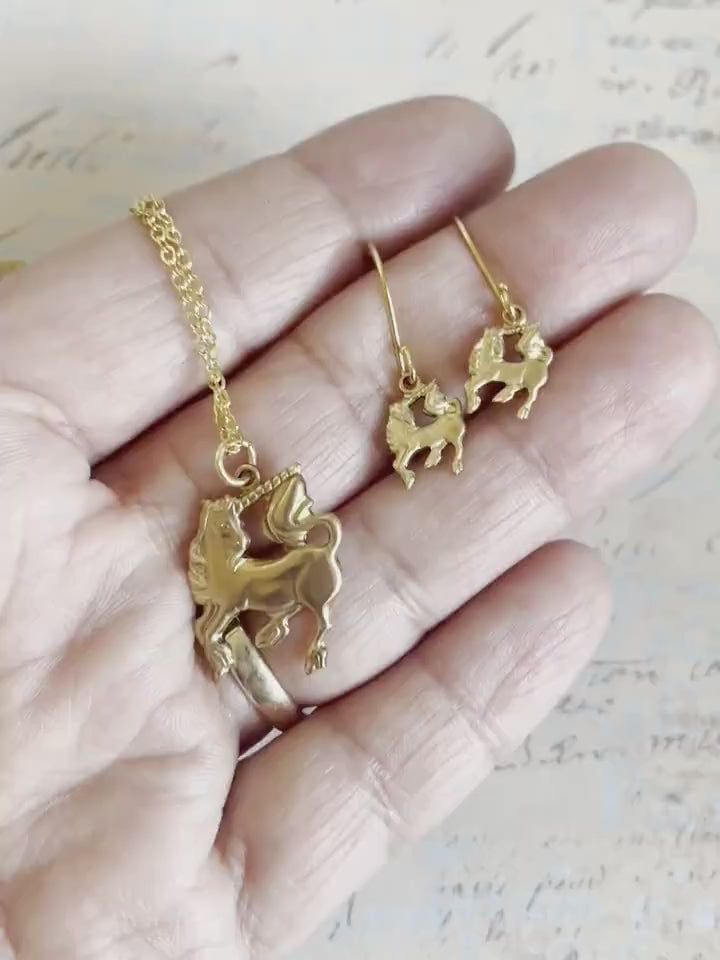 Magic II - Brass unicorn charm necklace, earrings, or set your choice