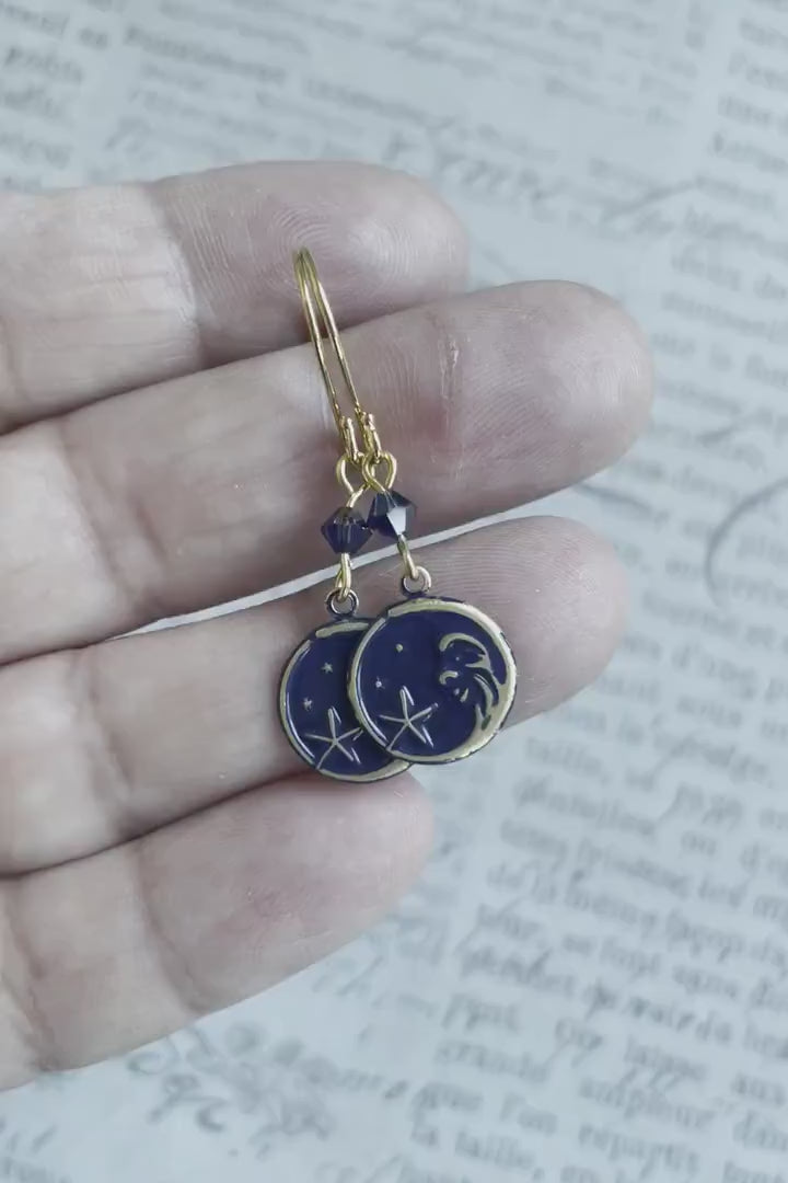 The dark navy enamel and vintage dark sapphire Swarovski crystals complement each other nicely, creating a cohesive color palette. The addition of gold-plated ear wires adds a touch of elegance and sophistication to the earrings.