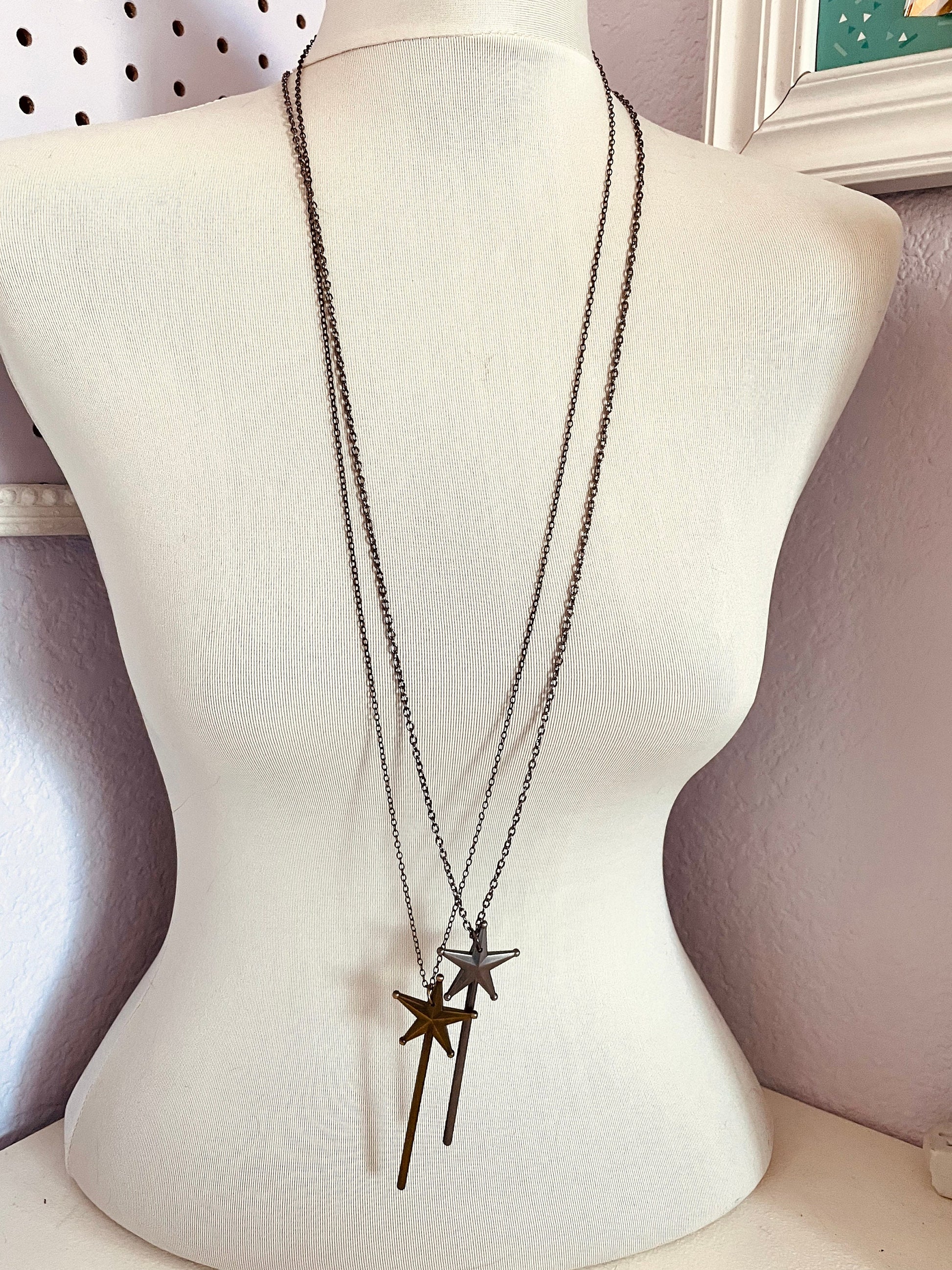 This a delightful necklace. The wand charm adds a touch of whimsy and magic to any outfit. The choice of a 35" gunmetal or bronze tone chain complements the charm nicely. With its plastic material and measurements of approximately 3" long and 1" wide, the wand charm becomes a standout feature of the necklace.