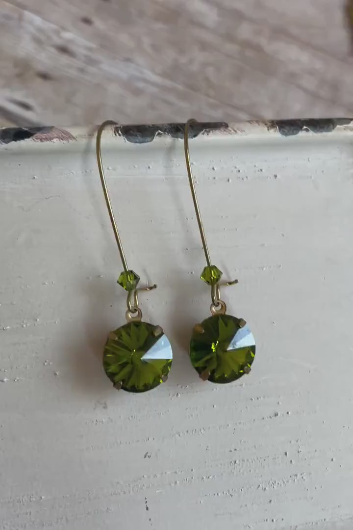 These Olivine green earrings are crafted with SWAROVSKI® crystals in a round rivoli shape, adding elegance and sparkle. The 12mm stones are meticulously set into antique brass drops, achieving a vintage-inspired appearance. The earrings hang from heart-shaped kidney ear wires measuring 1.5 inches, creating a graceful dangle. The combination of Olivine's green hue, dazzling crystals, and antique brass details make for a distinctive and captivating accessory.