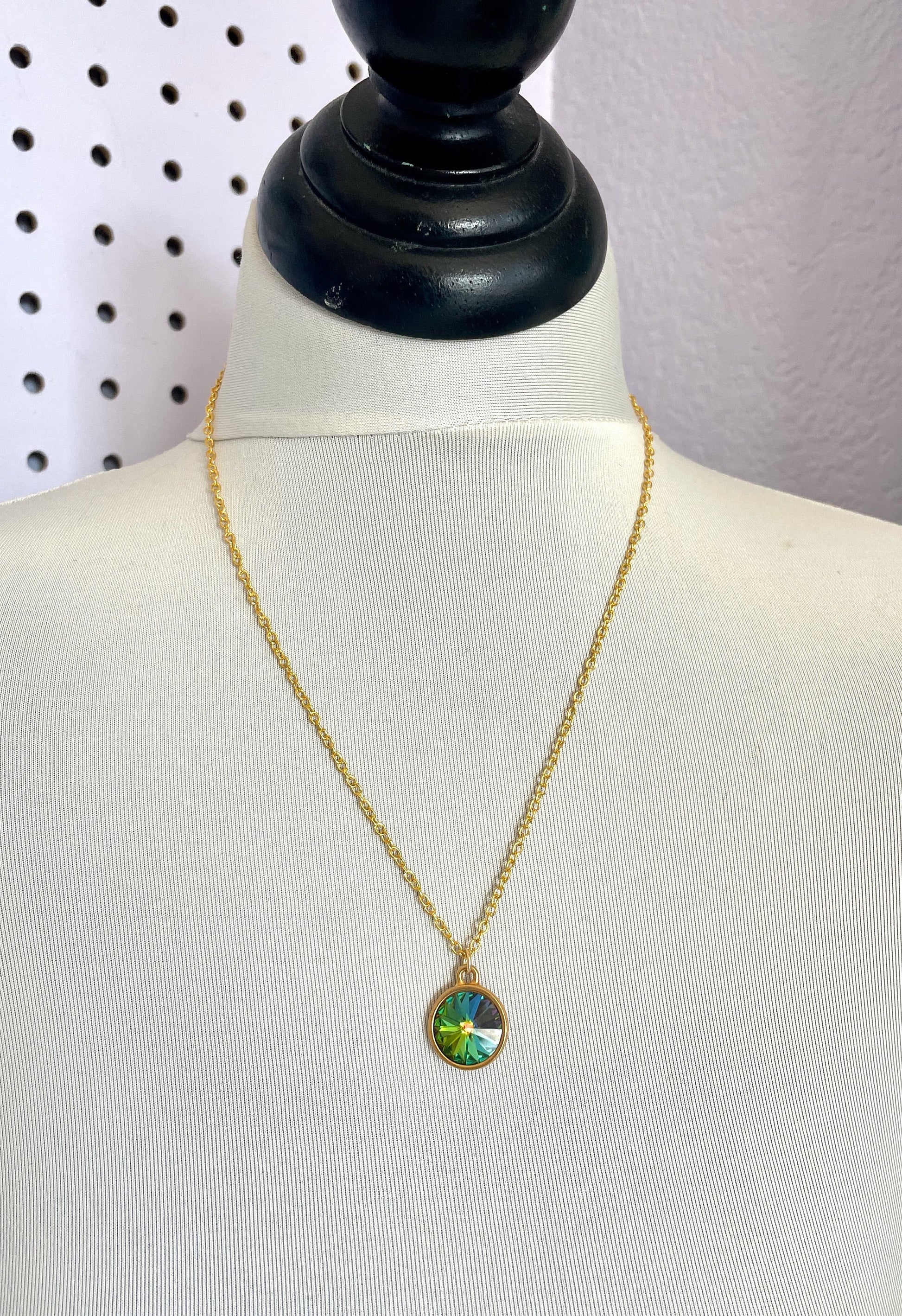 This rainbow necklace is absolutely dazzling! The handset Swarovski Crystal rivoli adds a touch of luxury and elegance to the piece. With its 14mm size, it's sure to make a bold statement. The round brass setting complements the crystal beautifully and provides a sturdy and stylish frame. The gold-plated chain adds a touch of warmth and sophistication to the necklace, creating a cohesive and eye-catching design.