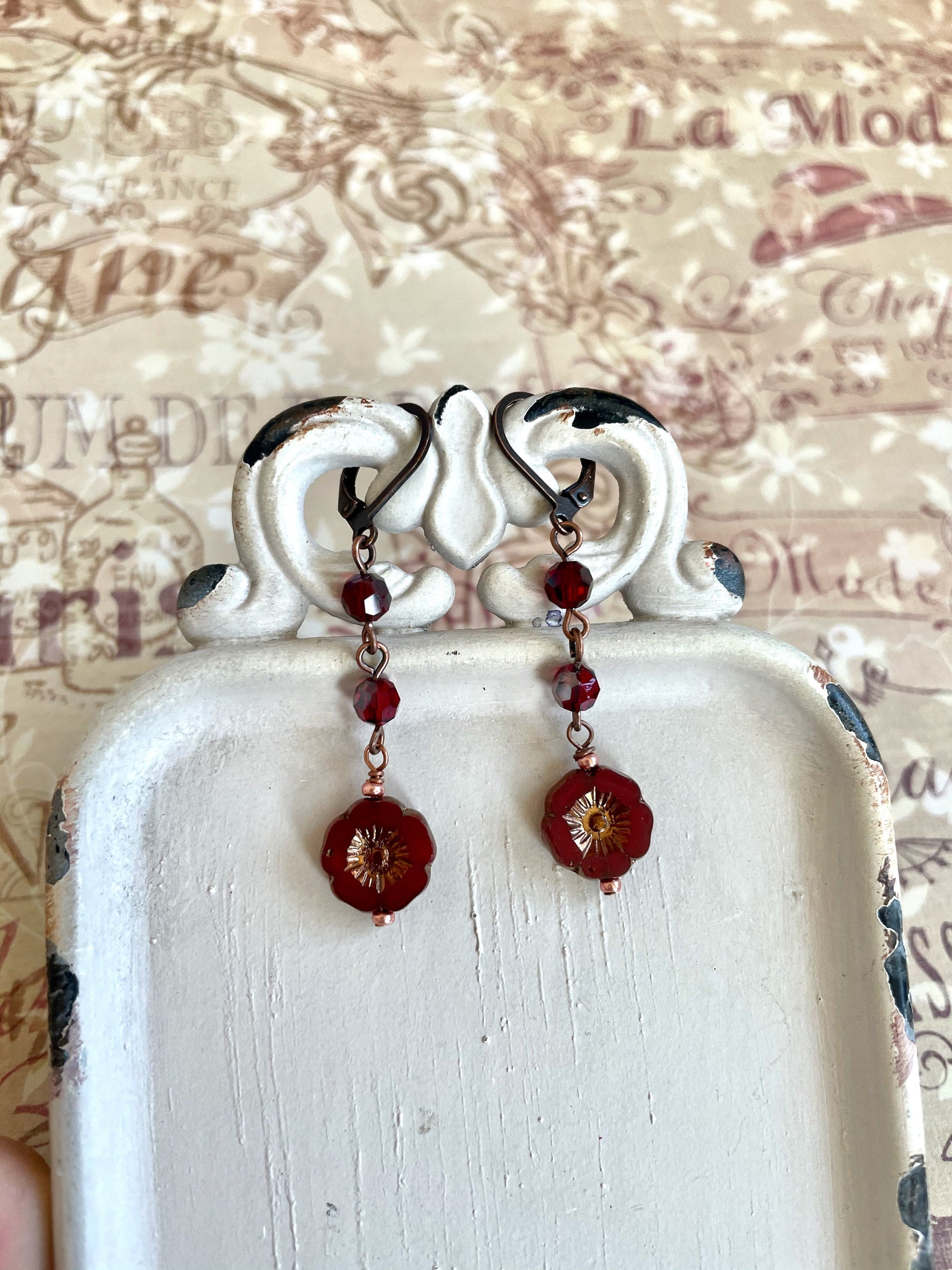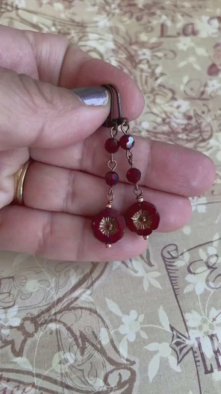 These red flower earrings are a of combination of glass floral beads and vintage red Swarovski crystals creating a beautiful and intricate design. The hand wrapping adds a touch of craftsmanship and attention to detail. The earrings are finished in an antique copper tone, which adds a vintage and rustic feel to the overall look.