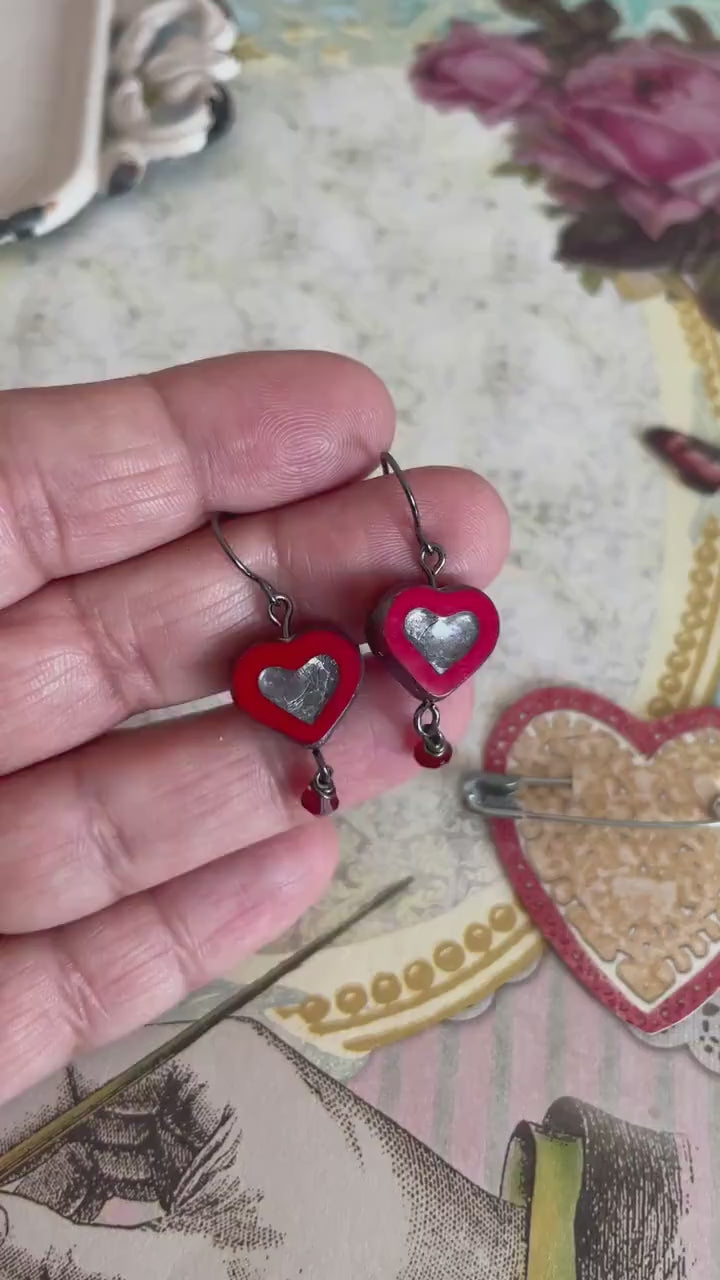 These Valentine's Day earrings are lovely and romantic. The combination of dark red glass heart beads measuring around 0.5" wide, along with matching red Swarovski crystal beads, creates a visually appealing design.
