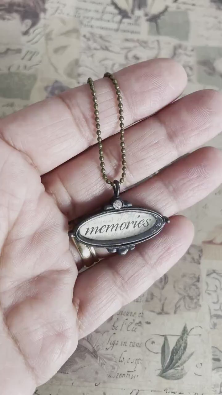 The necklace features a mini shadow box pendant that encases the word "Memories." The pendant has a vintage appearance and includes a small rhinestone for added detail and sparkle. The necklace itself is designed with a ball chain and measures 18" in length. It is commonly worn closer to the neckline due to its shorter length. The necklace is secured with a lobster clasp, which is a popular type of closure in jewelry. This necklace offers a sentimental touch with the "Memories" pendant, while also incorporating vintage elements. The small rhinestone adds a subtle hint of glamour. It is a charming piece that can serve as a meaningful accessory or a thoughtful gift.