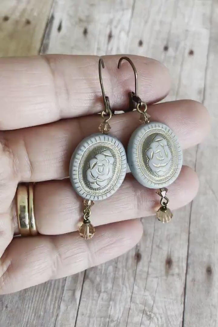 These handmade vintage-inspired light blue earrings are absolutely charming. The combination of acrylic oval beads and matching vintage Swarovski Crystals adds a touch of elegance and sparkle to the design. The etching of a gold rose in the center of the beads are a delightful detail, giving the earrings a unique and vintage feel.