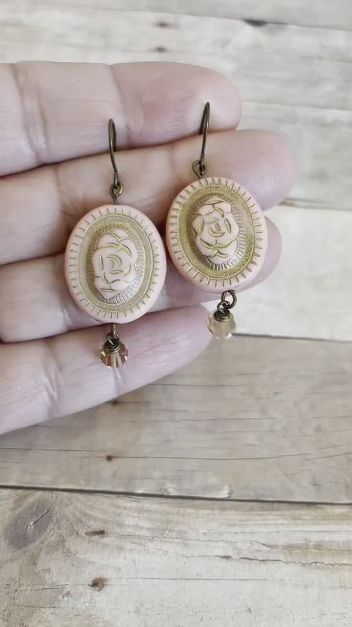 These vintage-inspired earrings are lovely. The combination of acrylic oval beads and matching vintage Swarovski Crystals gives them an elegant and timeless feel. The etching of a center gold rose on the beads adds a delicate and intricate touch. With a size of approximately 0.75", the beads provide a noticeable focal point while still remaining wearable and comfortable. The total length of the earrings at 1.25" creates a nice dangle that adds movement and enhances their visual appeal.