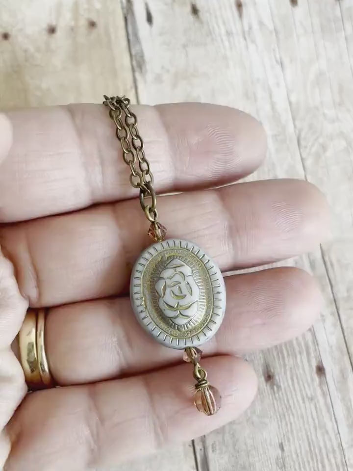 This is a lovely necklace with a vintage-inspired design. The light blue acrylic bead with a center gold rose design is absolutely beautiful. The etching adds a delicate and intricate detail that enhances the vintage aesthetic of the necklace. The use of a light blue color gives the necklace a soft and feminine touch. Hanging the bead on an antique brass tone chain further enhances the vintage-inspired feel of the necklace. The antique brass tone complements the color palette and adds a sense of nostalgia and charm to the overall design.This is a handmade necklace with vintage flair. The combination of the acrylic oval bead, Swarovski teardrop bead, and antique brass chain creates a visually appealing and stylish accessory. It's a beautiful piece that showcases your creativity and attention to detail.