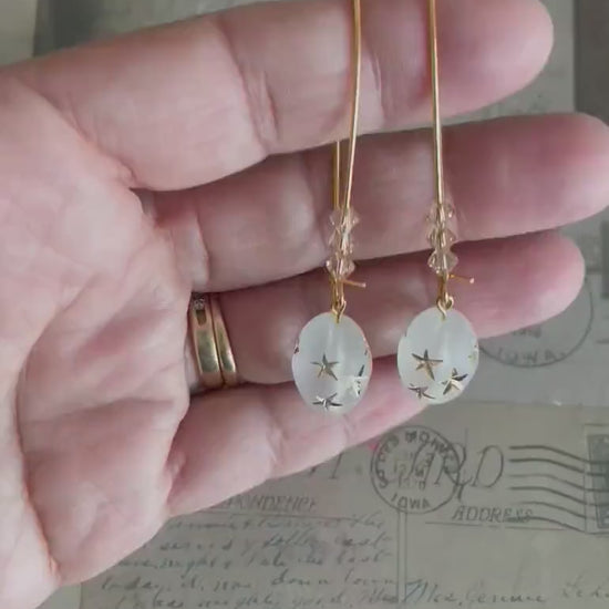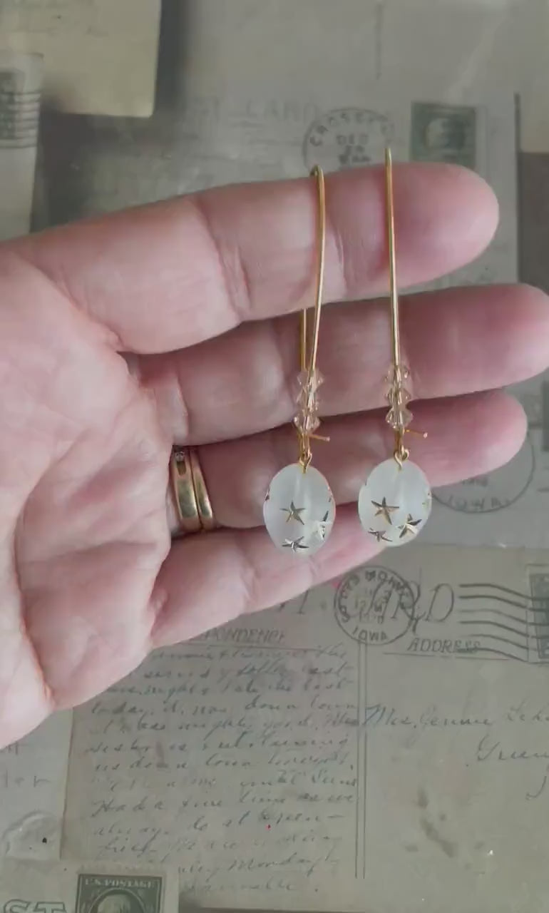 These handmade earrings use vintage frosted oval beads etched with beautiful gold stars adding a unique and enchanting touch to the design. Paired with sparkling Swarovski crystal beads, these earrings are sure to catch the light and create a dazzling effect. The earrings hang from gold-plated ear wires, ensuring a secure and comfortable fit. With a total length of approximately 2.5 inches, they have a noticeable presence and will elegantly frame the face when worn.
