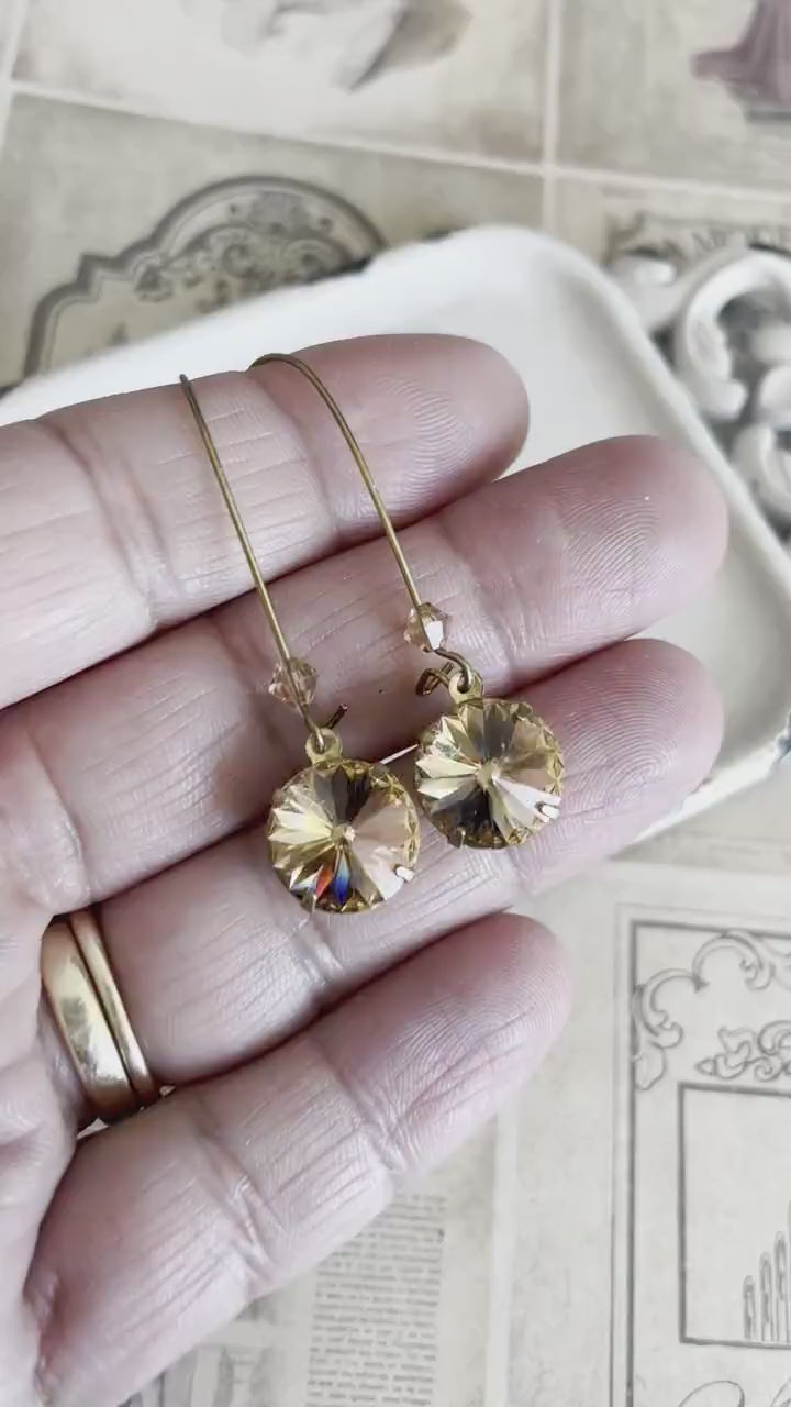 Those gold topaz earrings are beautiful! The use of glittering SWAROVSKI® crystals in the round rivoli shape adds a touch of elegance and sparkle to the design. The 12mm stones are hand-set into antique brass drops, creating a vintage-inspired look. The earrings hang from matching heart kidney ear wires that measure about 1.5 inches long, providing a graceful dangle.