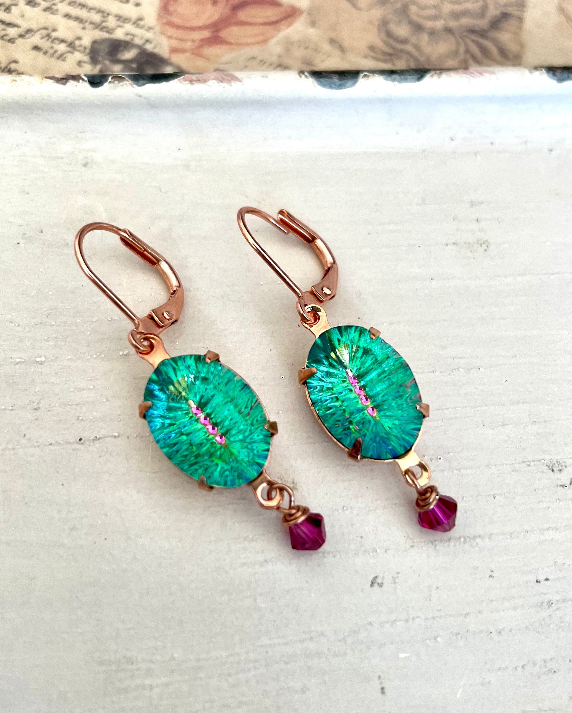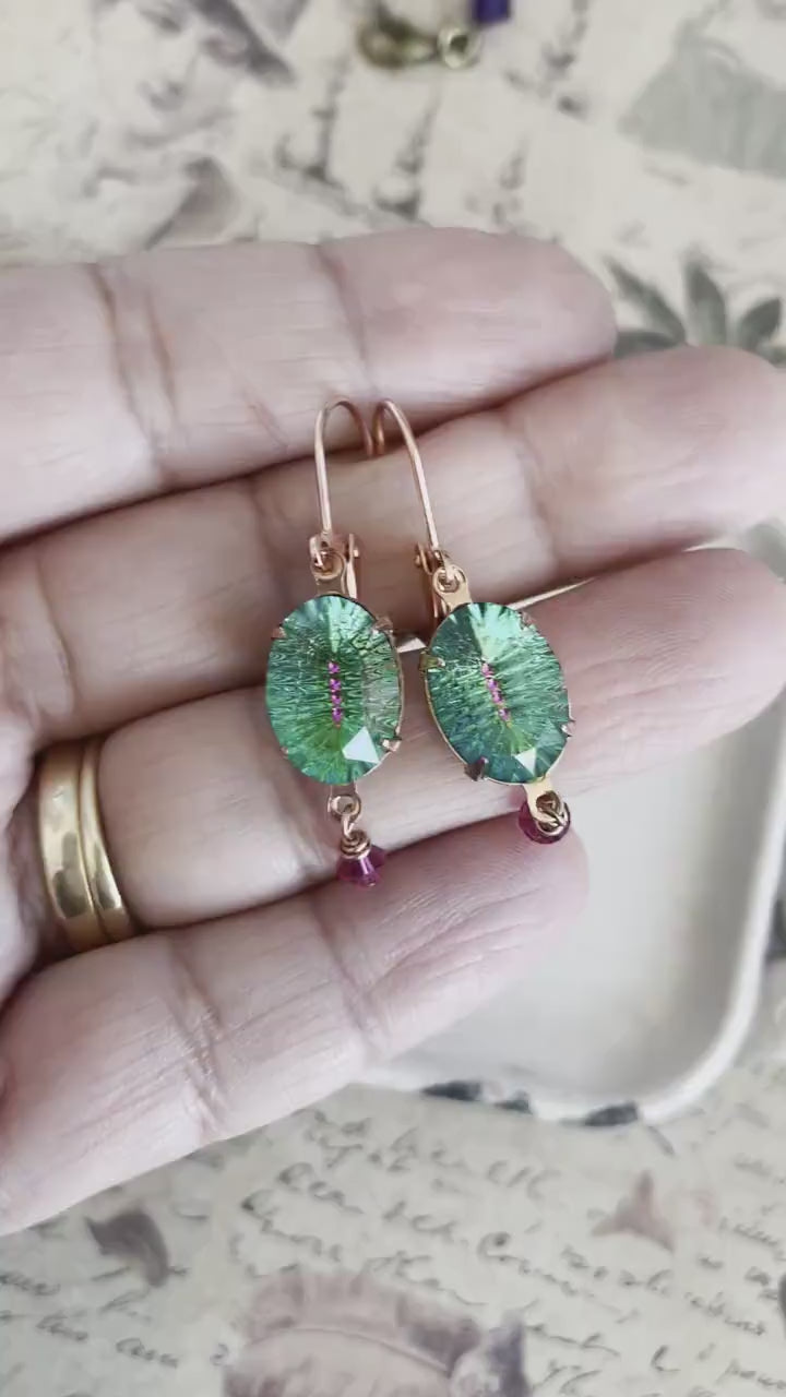 These vibrant earrings remind me of colorful parrot or tropical flowers. The glass oval stone is a stunning shade of green with a line of dark pink down the center. I have hung two matching pink Swarovski crystals from the jewels. Altogether they hang on copper plated ear wires for a total length of about 2".
