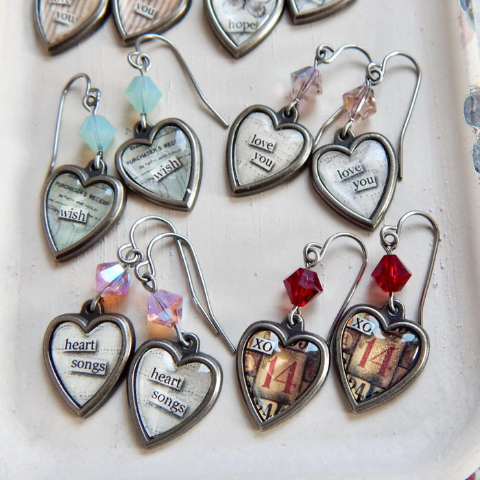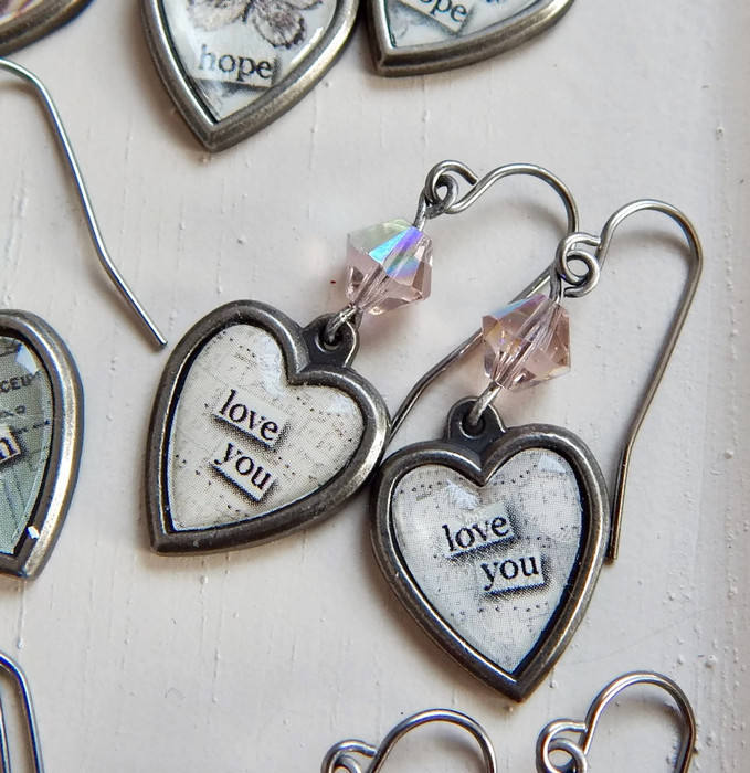 These sweet charm earrings are handmade with unique images and sparkling Swarovski crystal. Each antique silver charm and hand wrapped bead hang on matching ear wires for a total length of 1. 25". This pair reads Love You with a soft pink crystal bead.