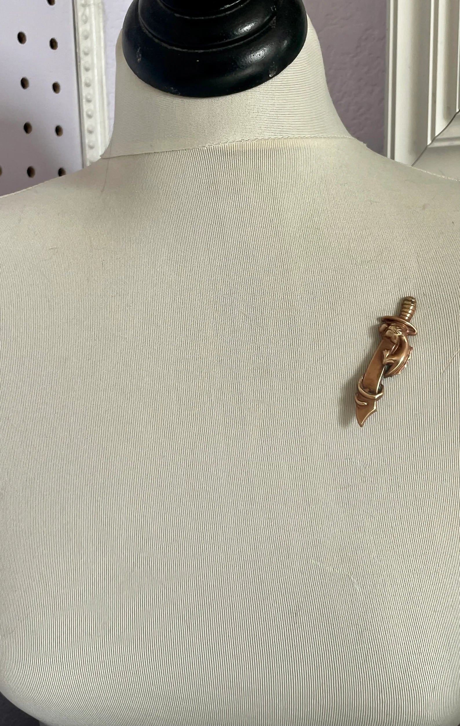 Crafted from a rare vintage 2.25" brass stamping, this fantasy pin can be worn either horizontally or vertically. Thanks to the natural aging of the brass, each piece features its own distinctive patina—no two are exactly alike.