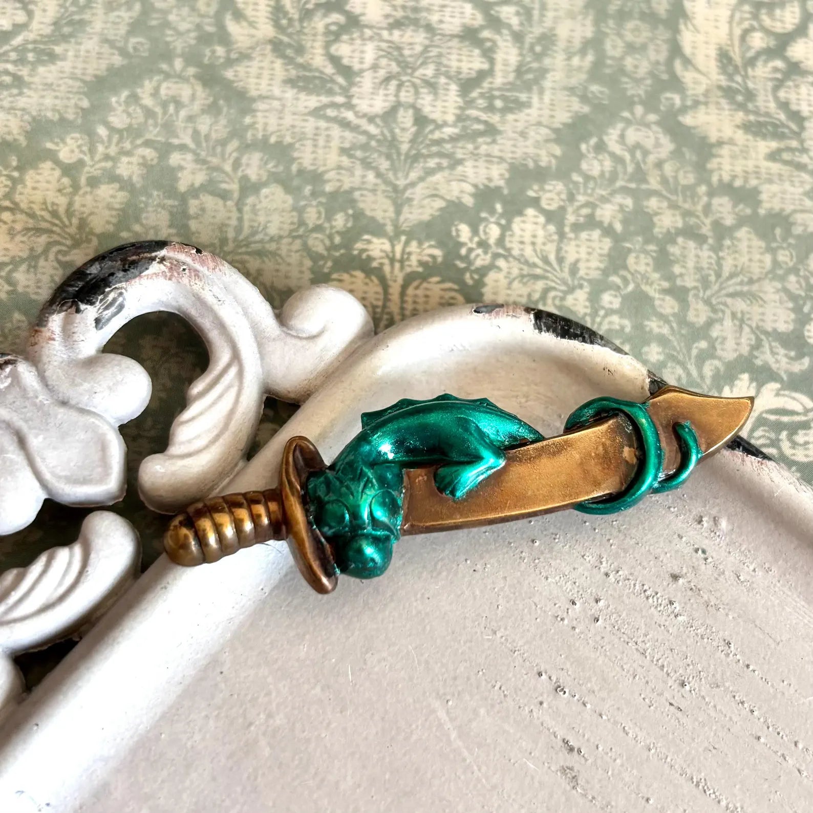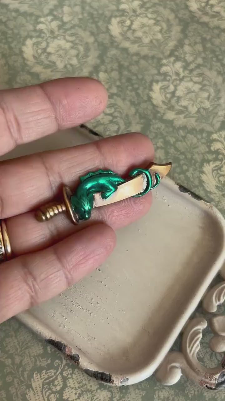 This charming little dragon is peacefully sleeping while curled around a sword or dagger, ready to adorn your jacket, bag, or display. Hand-painted in a shimmering green, each dragon boasts a unique and enchanting finish that beautifully catches the light.
