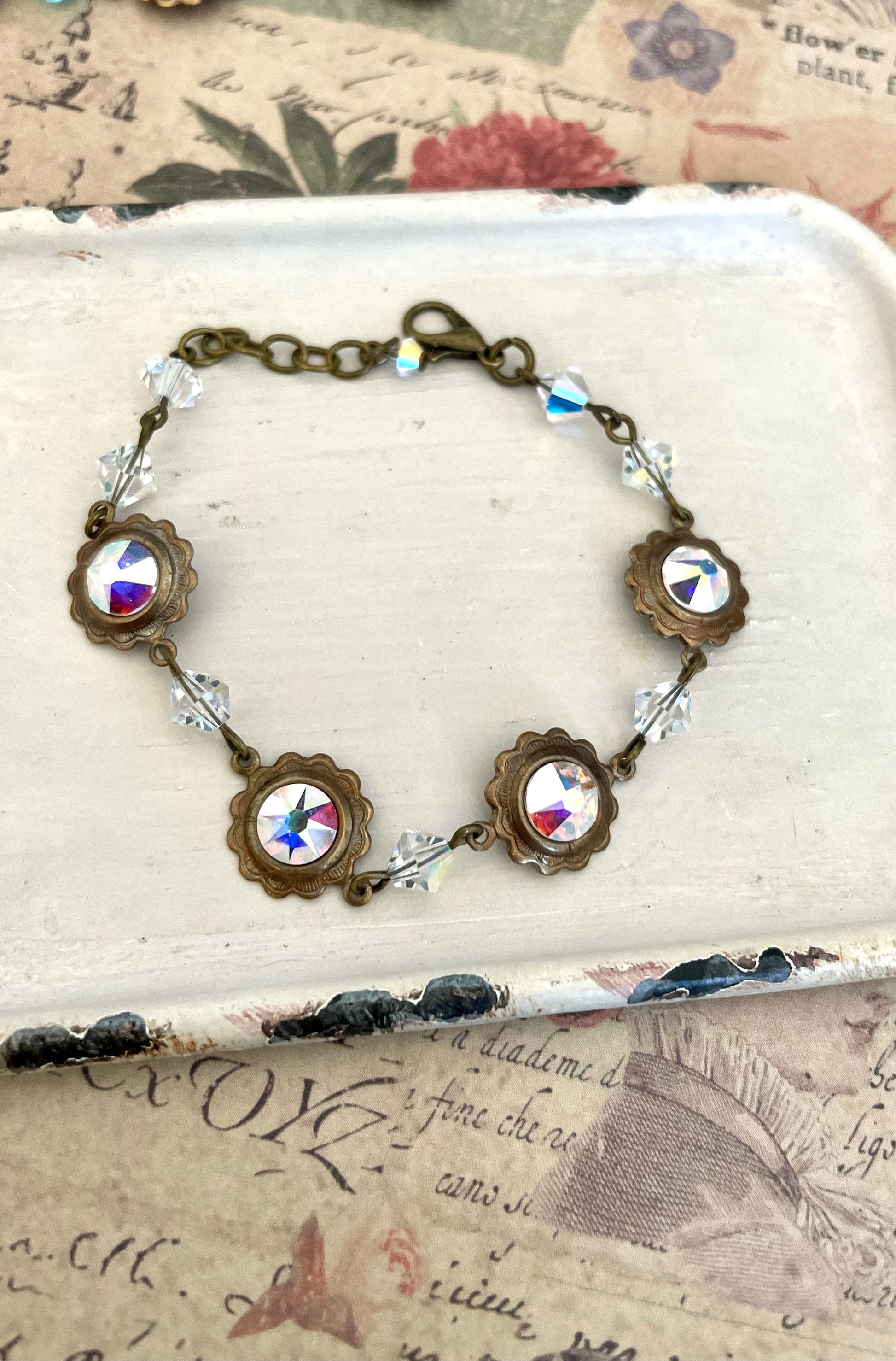 The antique brass connectors are made with a flat back crystals and I have hand wrapped matchingSWAROVSKI® beads in-between. The bracelets measure 7.5" in length.