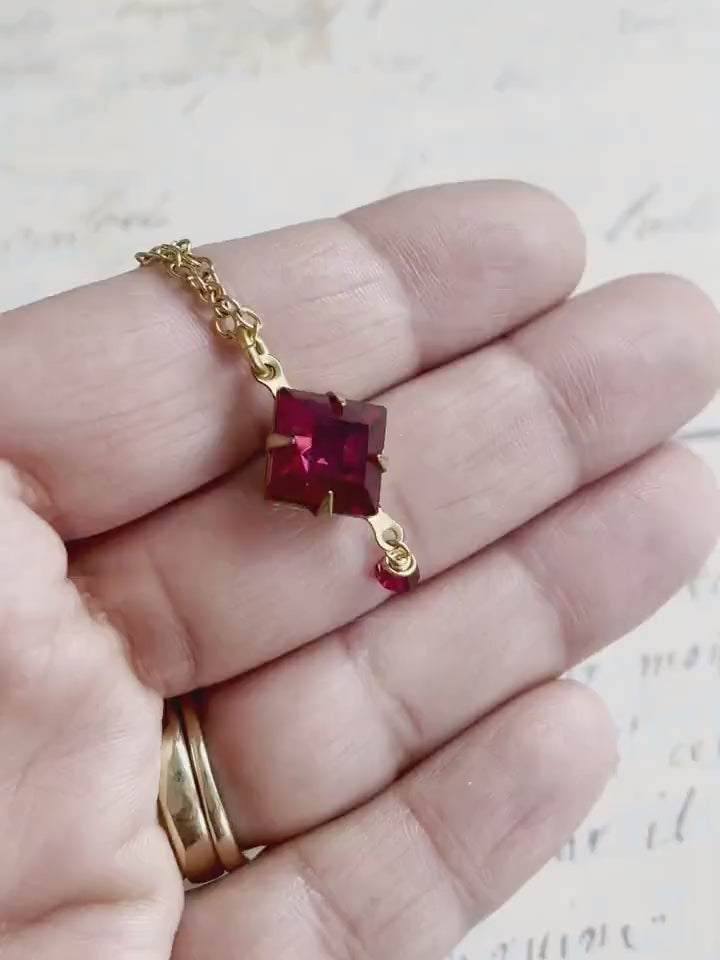 This is a lovely piece of jewelry. A vintage 10mm square SWAROVSKI® crystal in ruby red set into antique brass settings creates a beautiful and striking pendant. The crystal's vibrant red color adds a touch of elegance and sophistication.